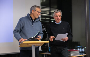 Der Vorstandsvorsitzende der Lavesstiftung Robert Marlow und der Juryvorsitzende Prof. Dr. Volker Droste von der Jadehochschule Oldenburg überreichten den mit insgesamt 5.000 € dotierten Lavespreis. Die Jury hatte zwei gleichwertige Arbeiten, jeweils von Studierenden der TU Braunschweig, mit dem ersten Preis prämiert.